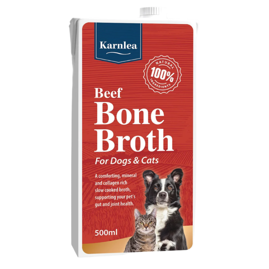 ?Karnlea Beef Bone Broth for Dogs & Cats is a highly nutritious supplement, slow-cooked from welfare beef bones and carcasses, and enriched with Apple Cider Vinegar to extract vital minerals and collagen. Free from hormones, antibiotics, and additives, and protein-rich.?