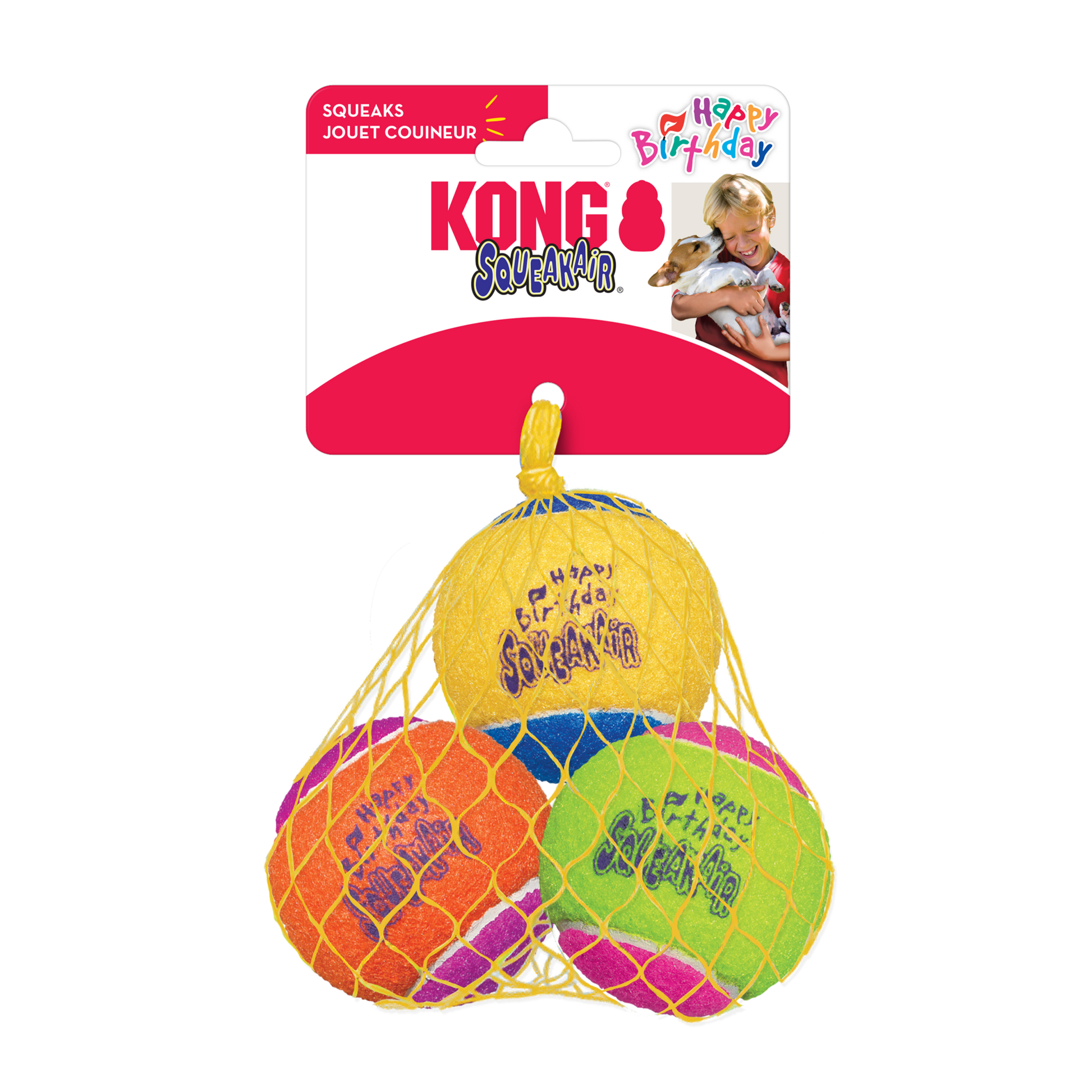 Make every game of fetch extra fun with the KONG SqueakAir Birthday Balls! Combining the classic tennis ball with a built-in squeaker, these durable and high-quality balls are designed for endless interactive play. Made with a special non-abrasive felt, they are gentle on your dog¡¯s teeth while providing hours of fetching fun. Whether for a birthday celebration or everyday exercise, these bouncy, squeaky, and festive balls are the perfect gift for active dogs!