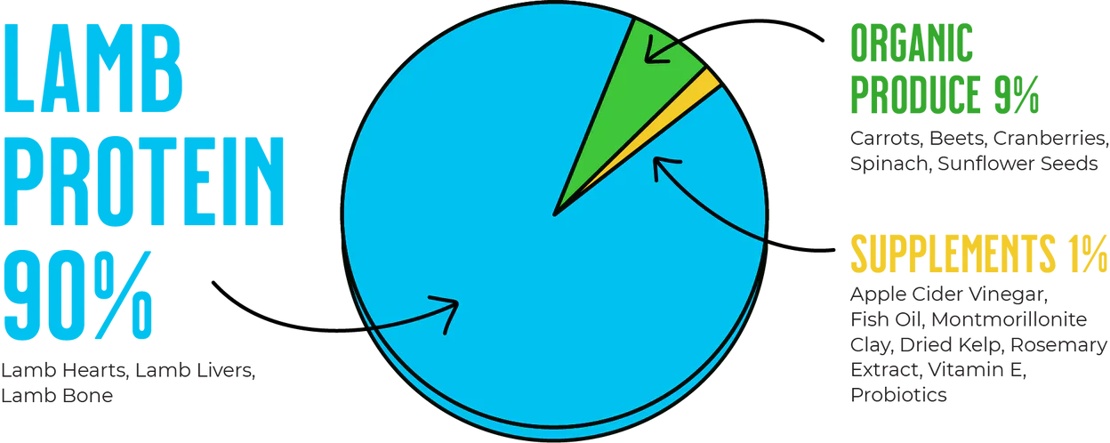 Lamb Hearts, Lamb Livers, Organic Carrots, Organic Beets, Lamb Bone, Organic Cranberries, Organic Spinach, Organic Sunflower Seeds, Organic Apple Cider Vinegar, Fish Oil, Montmorillonite Clay, Dried Organic Kelp, Organic Rosemary Extract, Vitamin E, Dried Bacillus Coagulans Fermentation Product (probiotic)