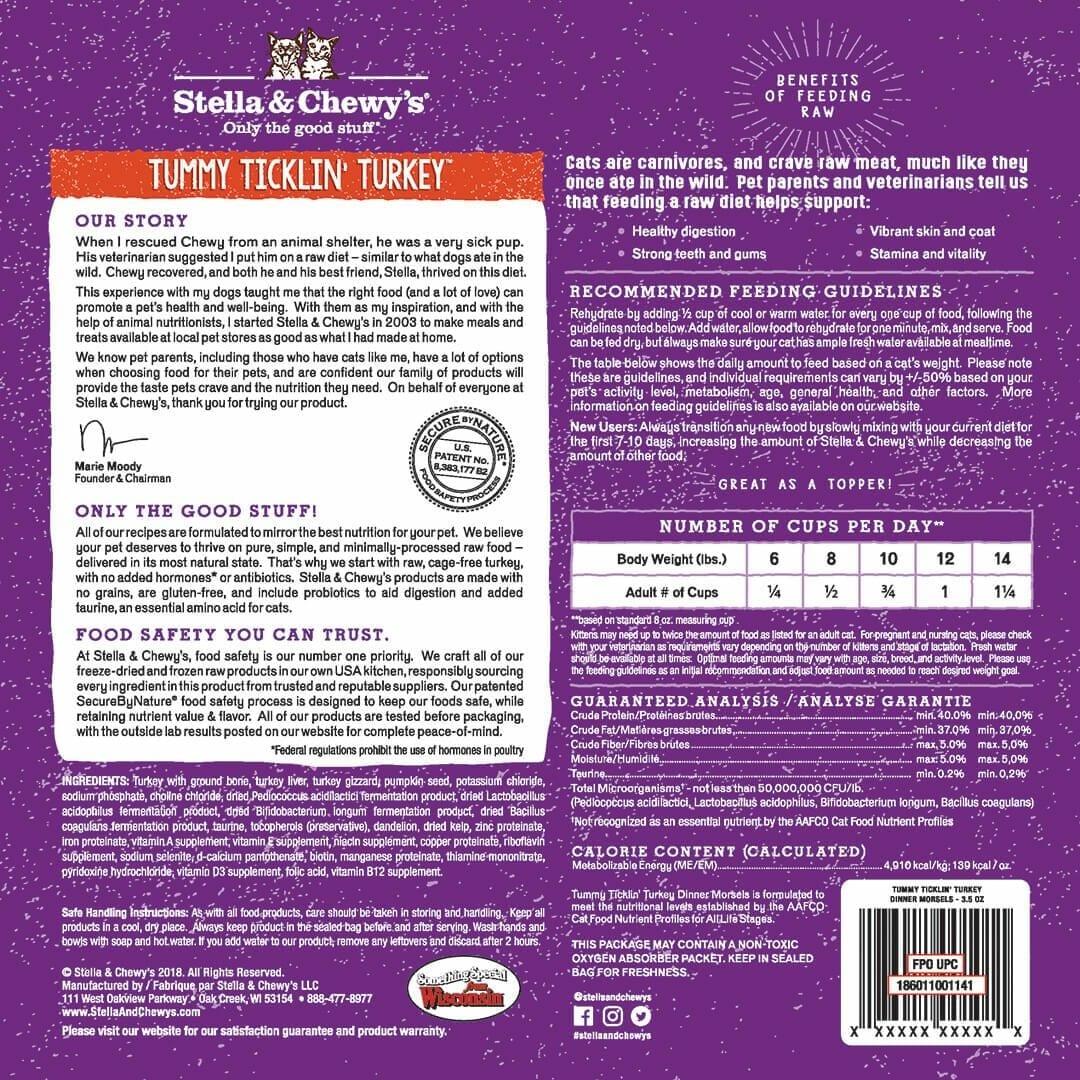 -Made in the USA - Stella & Chewy's Freeze-Dried Raw Tummy Ticklin' Turkey Dinner's all-natural recipe is crafted with care in small batches in Stella & Chewya?s own USA kitchen to provide the highest levels of protein-rich meat and quality grain-free nutrition for your cat